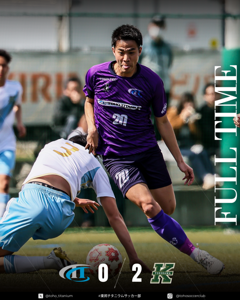 ニュース 天皇杯 JFA 第106回全日本サッカー選手権大会神奈川県代表決定戦 2026年3月7日 試合日 3月7日(日)12:30キックオフ 会場 かもめパーク(人工芝) 結果 東邦チタニウム 0 (前半:0-2/後半:0-0) 2 関東学院大学 応援ありがとうございました。 Share: Previous Post 新規加入選手のお知らせ You Might Also Like 関東サッカーリーグ前期6節観戦のご案内 2023年5月22日 2019年度関東サッカーリーグ2部 前期第7節vsエスペランサSC 3-2 勝利 2019年6月22日 新規加入選手のお知らせ 2024年2月29日